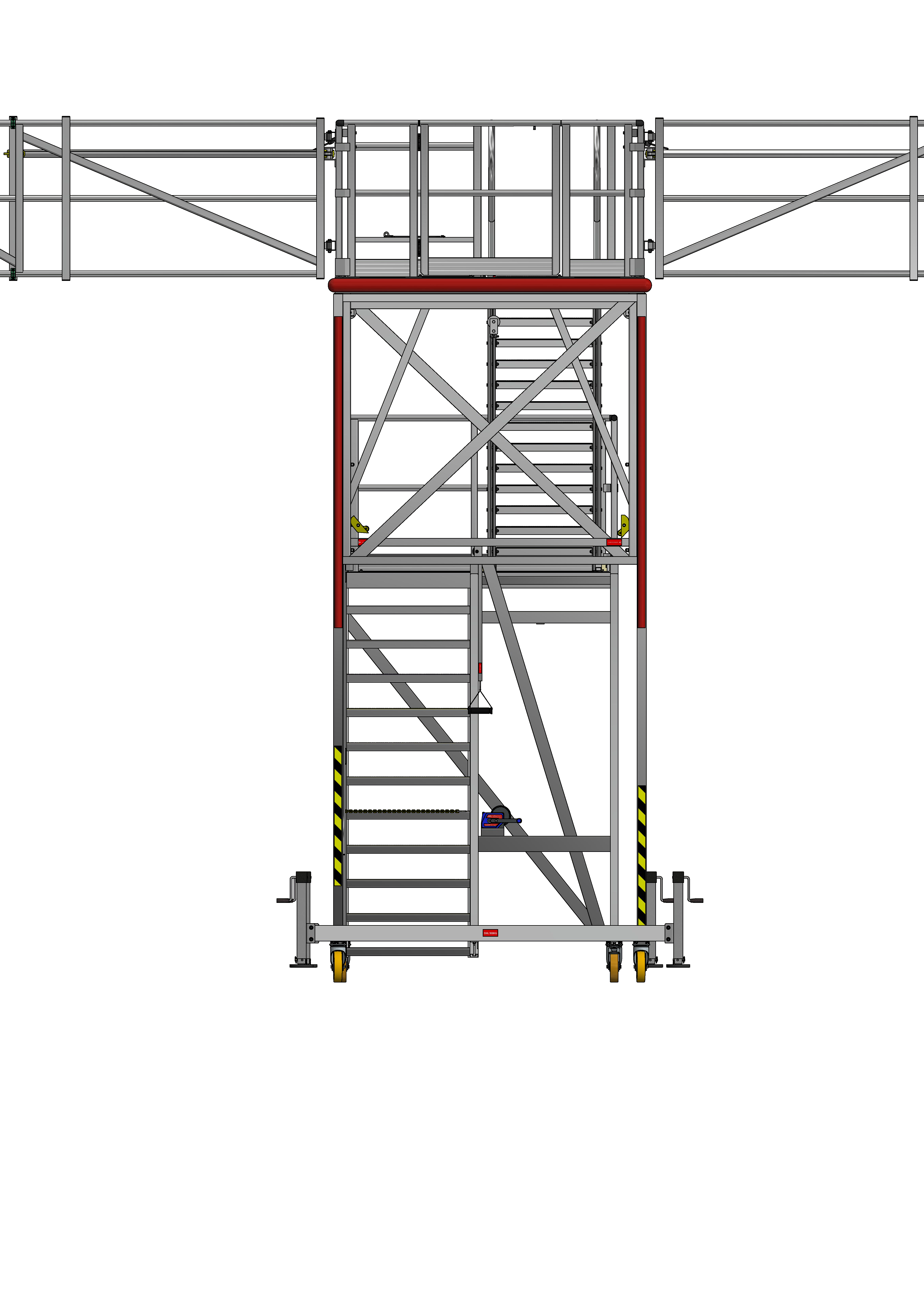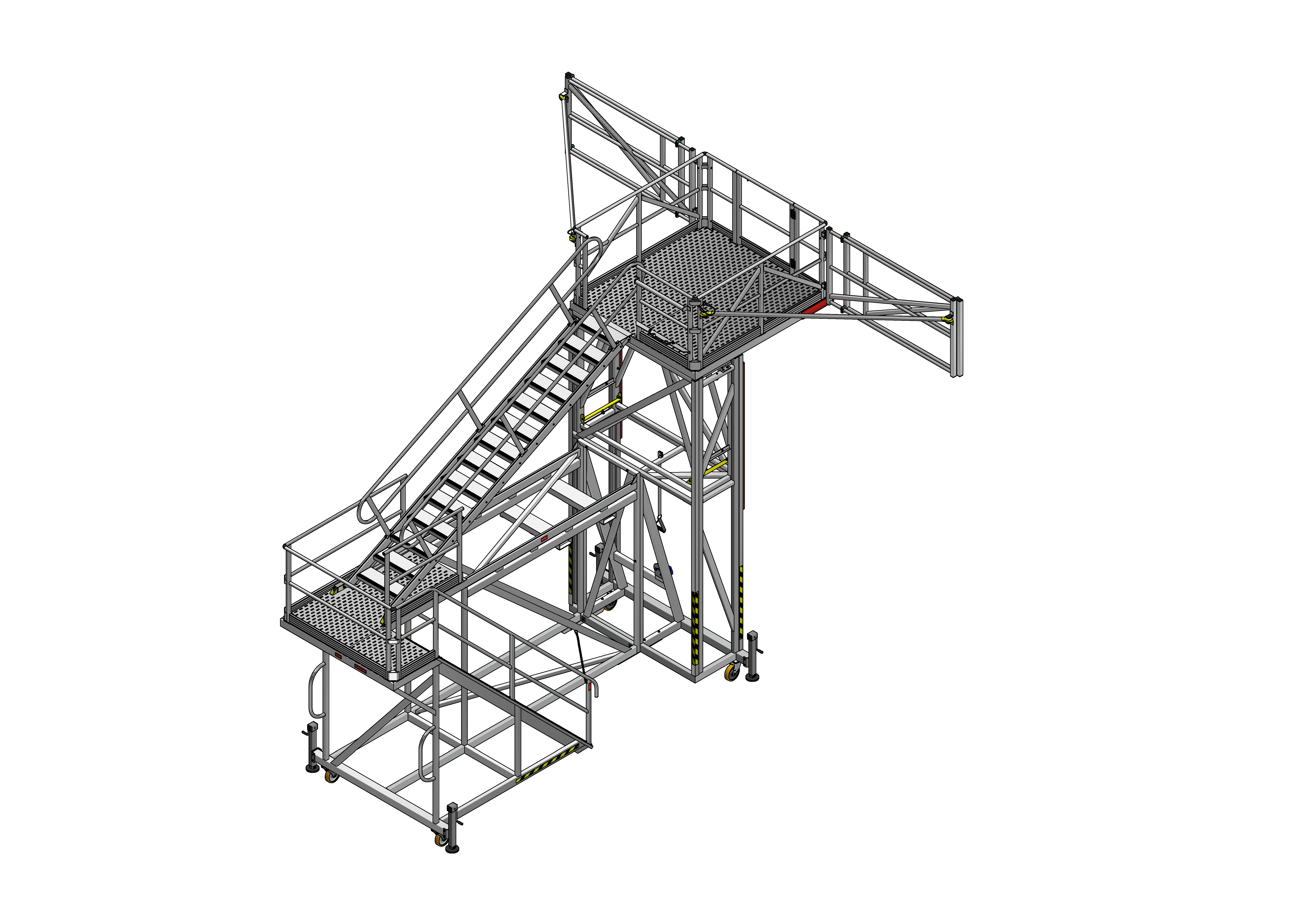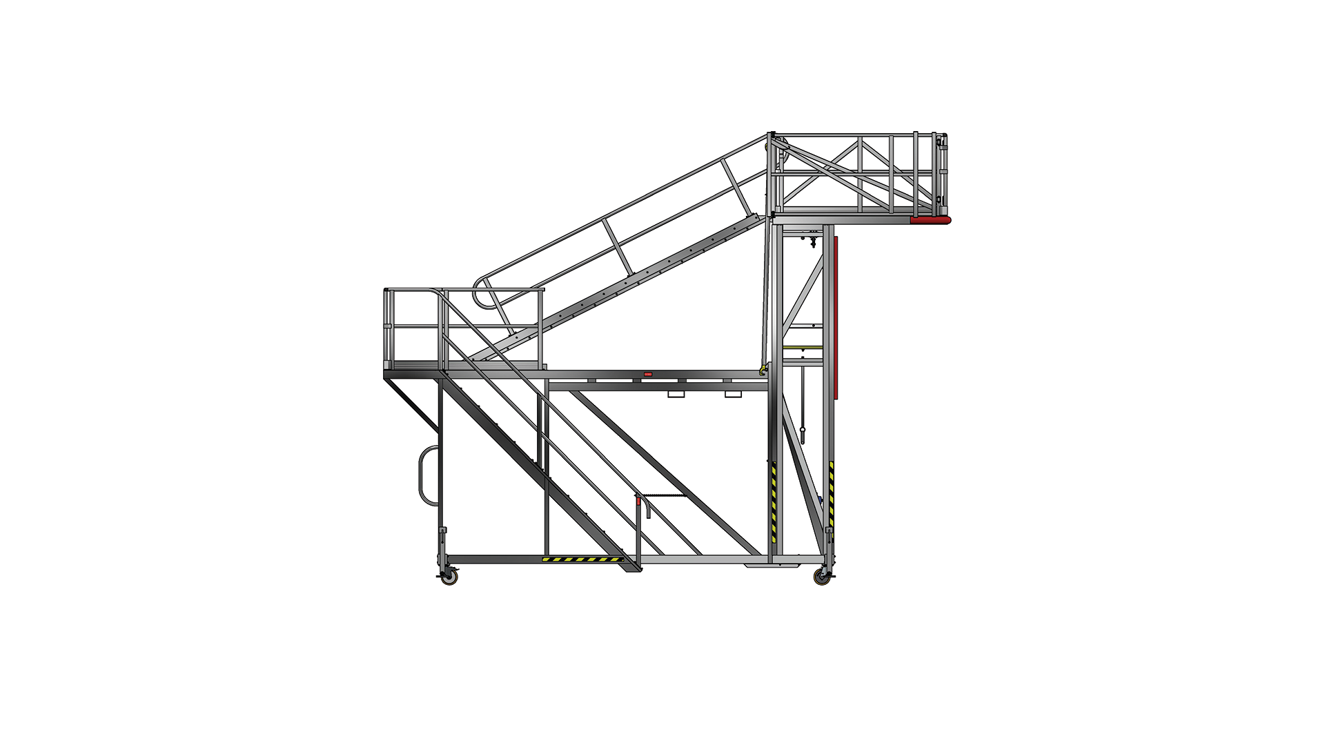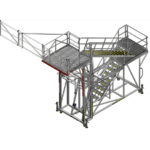 This is a height adjustable work platform with telescopic folding edge protection wings for direct access into the back of Haul Truck Trays.