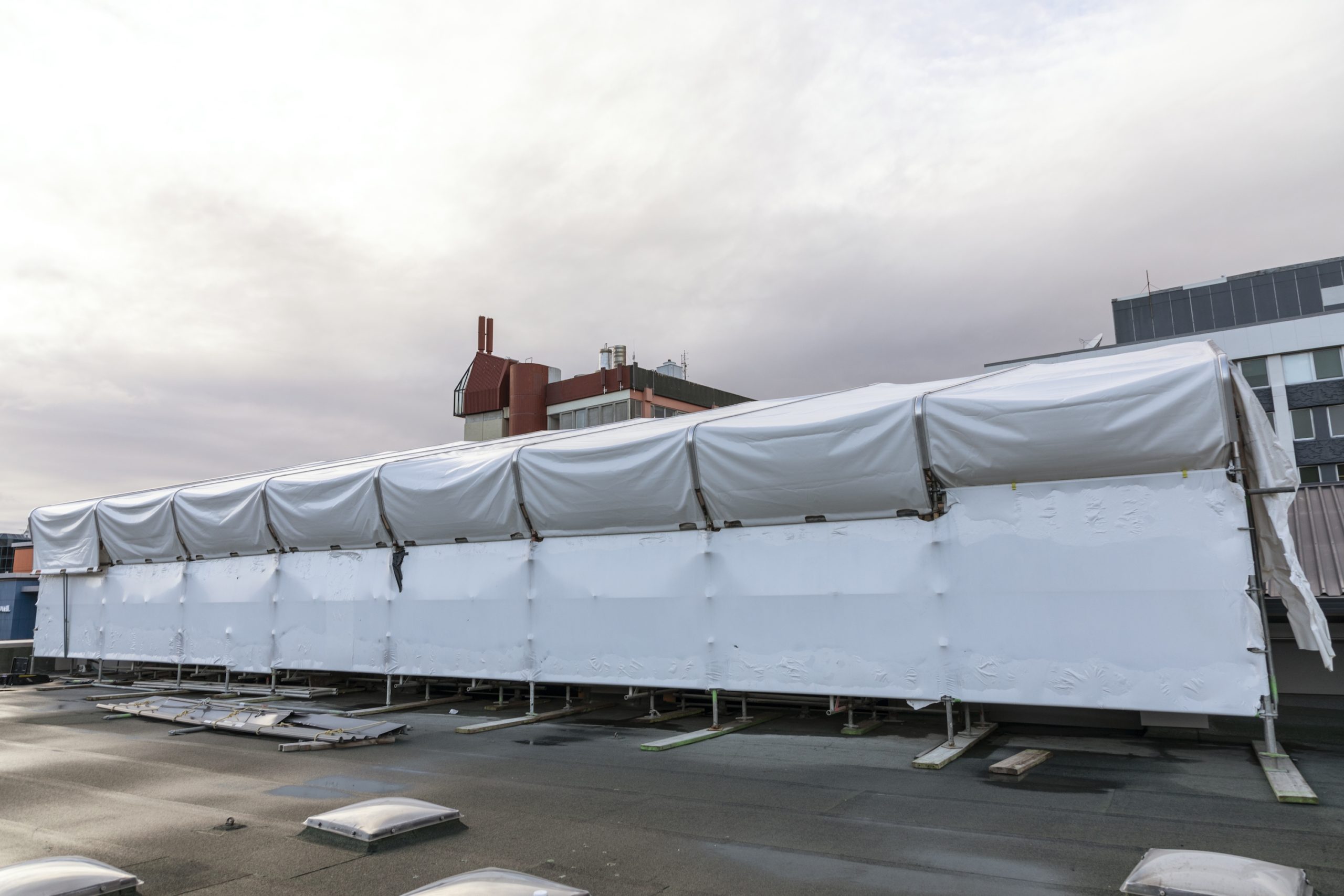 The result? A reusable, no waste, temporary roof and wall system, designed in conjunction with the scaffolding industry.